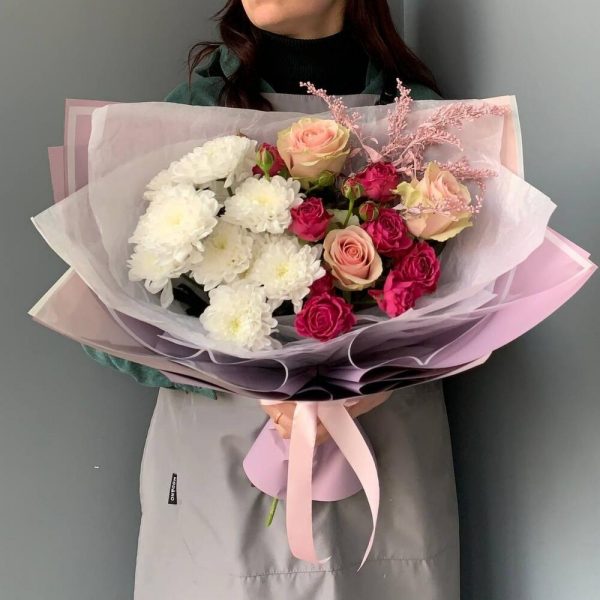 Букет с импортной и кустовой пионовидной розой в Гавриловом Посаде